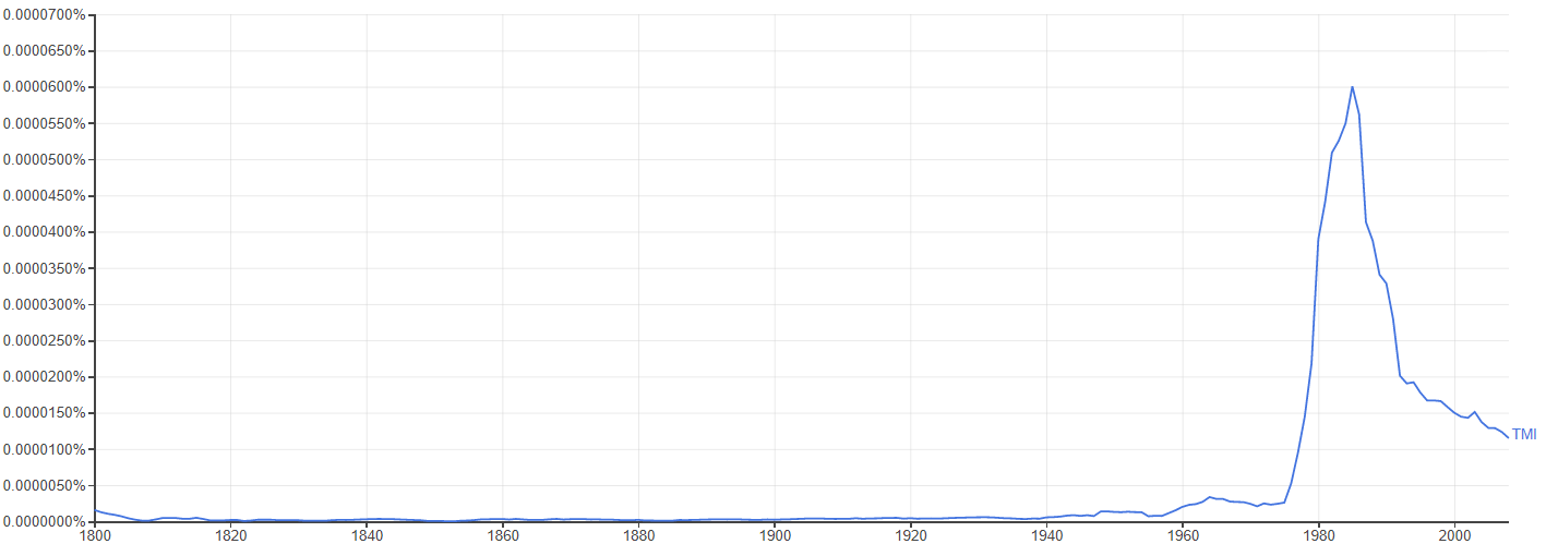 TMI이란 단어의 연도별 사용횟수를 구글로 조회해보니, 1970년부터 갑자기 많이 사용된것으로 보아, 현대 영어에서 새로만들어진 신조어인 것을 알수 있습니다.