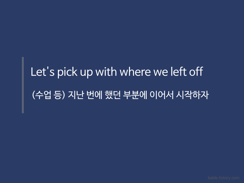 영어 수업이나 대화 중에 특정 지점을 다시 찾고 싶을 때 사용할 수 있는 유용한 표현들이 있습니다. 오늘은 그 중에서도 "Where are we?"와 그 외 몇 가지 표현들을 살펴보겠습니다. 😊1. "Where are we?""Where are we?"는 수업이나 대화 중에 우리가 중단했던 지점을 다시 찾고 싶을 때 사용하는 간단하면서도 유용한 표현입니다. 직역하면 "우리 지금 어디에 있죠?"라는 뜻이지만, 수업의 어느 지점에 있었는지를 묻는 의미로 자주 사용됩니다.예제:"Where are we?"우리 어디까지 했죠?2. "Let's pick up where we left off yesterday."수업을 시작하면서 어제 중단했던 지점부터 다시 시작하자는 의미로 "Let's pick up where w..