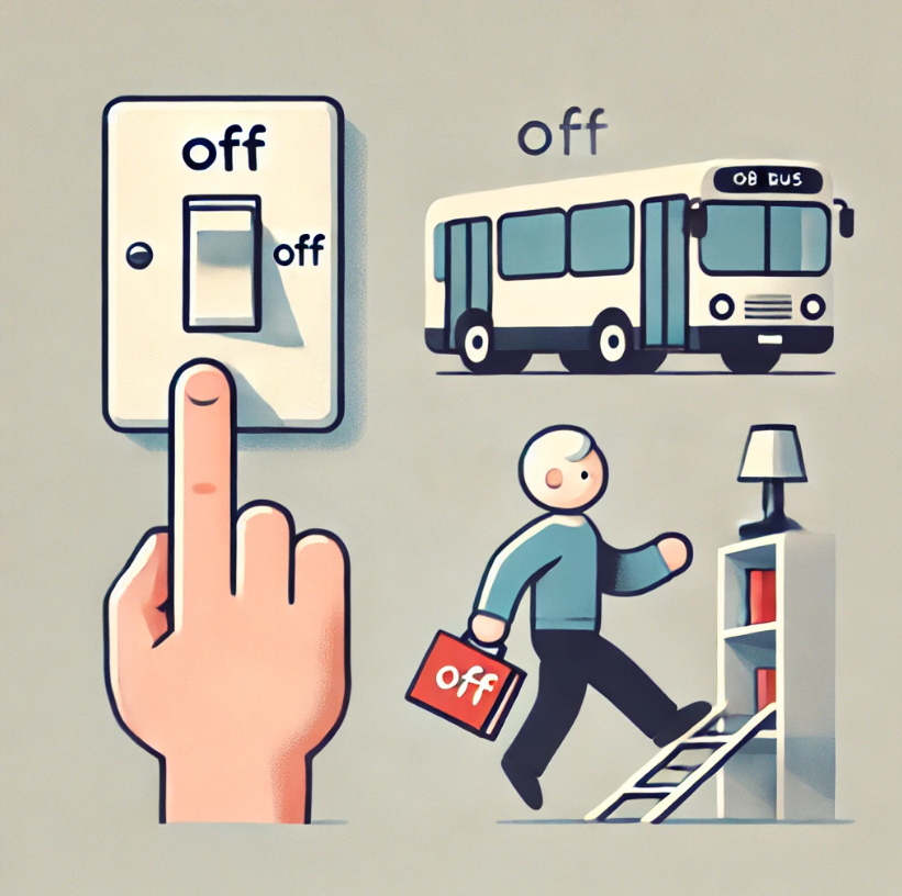 1. 원천으로부터 시공간적으로 떨어져 나감"Off"는 어떤 시작점이나 원천으로부터 떨어져 나가는 것을 나타냅니다. 즉, 무엇인가가 특정 지점에서 떨어져 나가거나 시작하는 것을 말합니다.출발/시작Take off (이륙하다): 비행기가 출발지로부터 날아오르는 것.They're off (그들이 출발했다): 경주나 활동이 시작된 것.위치에서 떨어져 나감Fall off the ladder (사다리에서 떨어지다): 사람이 사다리에서 떨어져 나가는 것.Off the road (도로에서 벗어난 지역): 도로가 아닌 다른 지역에 있는 것.기타Order off the menu (메뉴에 없는 걸 주문하다): 메뉴에 나와 있지 않은 음식을 주문하는 것.2. 일시적/잠정적으로 원천으로부터 벗어남"Off"는 잠시 동안 원래 상태..
